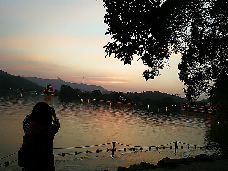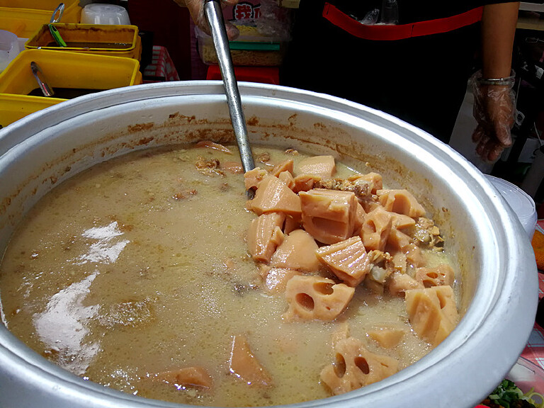 去年在广东巽寮湾过冬时,我们包车去惠州的罗浮山和西湖(看夜景)。中午在罗浮山只简单吃了点东西就往西湖赶,到西湖已经快4点了。见拍夜景时间还早,先去西湖边的小吃街逛逛。因为还没到吃饭时间,小吃街上人不多,我们来到一个小吃摊前,看到有热腾腾的莲藕汤和面什么的,顿时饥肠辘辘,上午玩得又累又渴,干脆先把晚饭解决了。