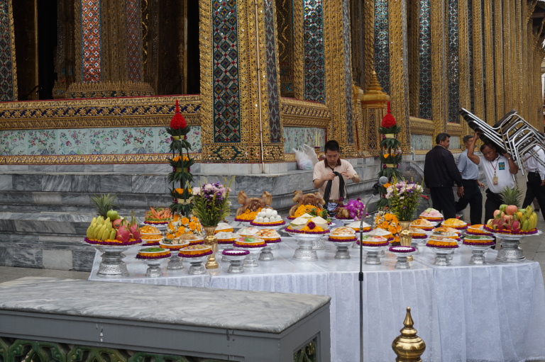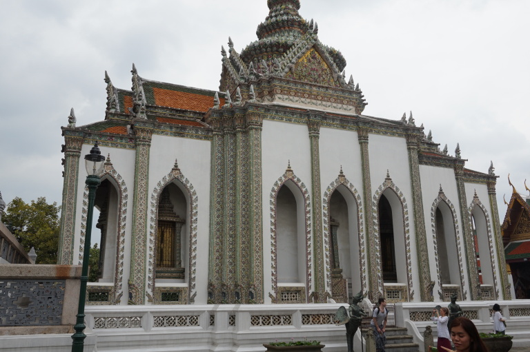 去泰国曼谷的时候参观了那里的玉佛寺,玉佛寺内的庙宇金碧辉煌,让我叹为观止。泰国是一个90%以上国民信奉佛教的国家,所以庙宇在泰国可以说是随处可见,这一点,电影《泰囧》里就呈现出很多。泰国的玉佛寺建于1784年,玉佛寺是泰国大王宫的一部分,面积约占大王宫的1/4。玉佛寺是泰国王族供奉玉佛像和举行宗教仪式的场所,因寺内供奉着玉佛而得名。寺内有玉佛殿、先王殿、佛骨殿、藏经阁、钟楼和金塔。玉佛殿是玉佛寺的主体建筑,大殿正中的神龛里供奉着被泰国视为国宝的玉佛像。我们去游览玉佛寺的时候,泰国的皇室人员正好要在玉佛殿内朝拜,所以游客不得入内,运气也太不好,先是皇家御会馆休馆,后是玉佛殿不得进入,不过玉佛殿只是玉佛寺的一部分,其余的建筑真的是让游客目瞪口呆,如此奢华的庙宇,也就在泰国可以看到。