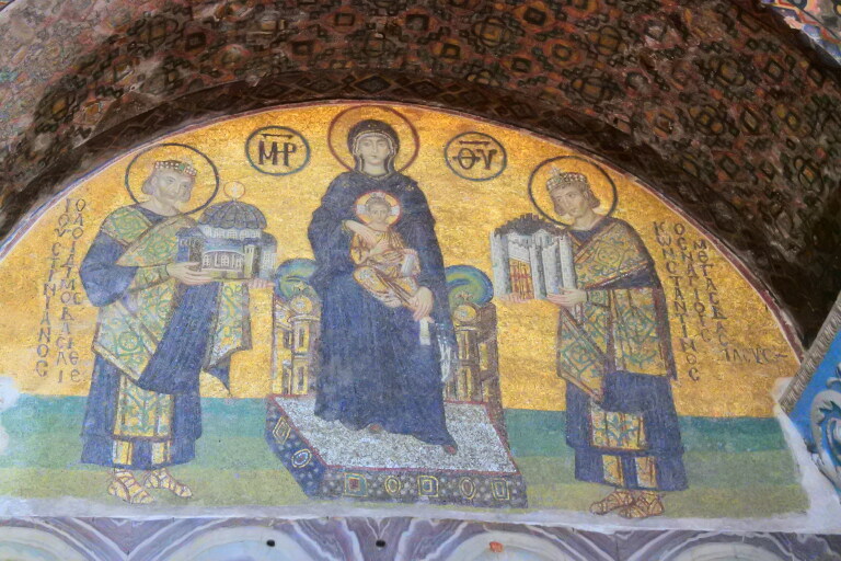 圣索菲亚大教堂的布局属于以穹隆覆盖的巴西利卡式,内部空间饰有金底的彩色玻璃镶嵌画,装饰地板、墙壁、廊柱则是五颜六色的大理石,柱头、拱门、飞檐等处以雕花装饰,圆顶的边缘有40具吊灯,可谓光彩夺目,教坛上镶有象牙、银和玉石,大主教的宝座以纯银制成,祭坛上悬挂着丝与金银混织的窗帘,上有皇帝和皇后接受基督和玛利亚祝福的画像,让我最为赞叹的当属二楼,用有色大理石镶成的马赛克拼图,人物表情逼真,衣着华丽,十分耐看。