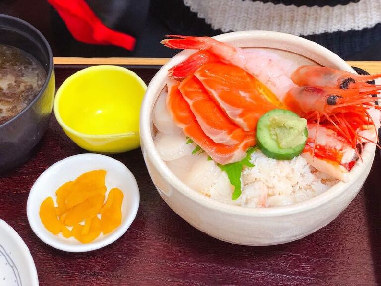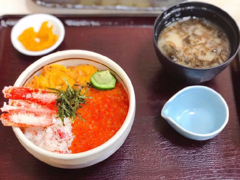 来函馆朝市建议品尝这里的海鲜盖饭,惠比寿食堂是函馆朝市比较热门的店铺,主营的就是海鲜盖饭。惠比寿食堂一共有两个门,一个门位于马路边,从函馆站出来后就能看到,还有一个门是位于站二市场内,相通的,每个门旁边都有一个展示窗,里面展示的餐品的样式和价格,挺人性化的,也算是和周边的商家公开竞争吧。店内的面积不是很大,也就几个桌子,最多也就坐20位食客了。北海丼,没有分大、中、小份,一份含税1728日元,也是由3种海鲜搭配而成,分别是甜虾、北极贝和蟹腿肉。从甜虾和北极贝的口感上就能品尝出这里的海鲜的确很新鲜。三色丼,搭配的是蟹腿肉、鱼子和海胆,有大、中、小的量可以选择,小份含税1587日元,中份2138日元,大份2700日元。我以前都不喜欢吃海胆的,但是品尝过这里的海胆后,我开始接受海胆了,蟹腿肉和鱼子的量很多,加一点酱油拌饭,味道的确很好。