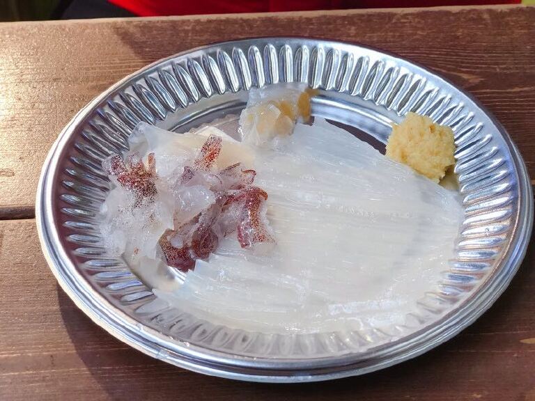 站二市场的中心位置有一个项目是游客都会体验的,就是钓活章鱼,再现场加工,品尝章鱼刺身。每天的价格也会有所变动,我们去的时候是510日元一条。钓活章鱼的人数很多,所以尽量早点去,8点左右没有什么人,9点一过,人就开始多起来了,有些人一钓就钓起来了,有些人钓需要钓很久,所以可能需要等待很久。钓活章鱼的流程很简单,轮到你后,付钱给商家,商家会给你一张券和一个钓章鱼的杆,券上有编号,拿到券和吊杆后,你就可以去钓了,钓上来后,去加工处把票给加工的人员,加工人员会拿着你钓上来的章鱼当面切片。加工完可以在站二市场的餐桌上品尝,品尝完后记得把盘子还给商家。