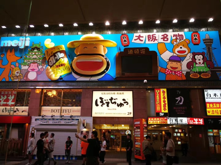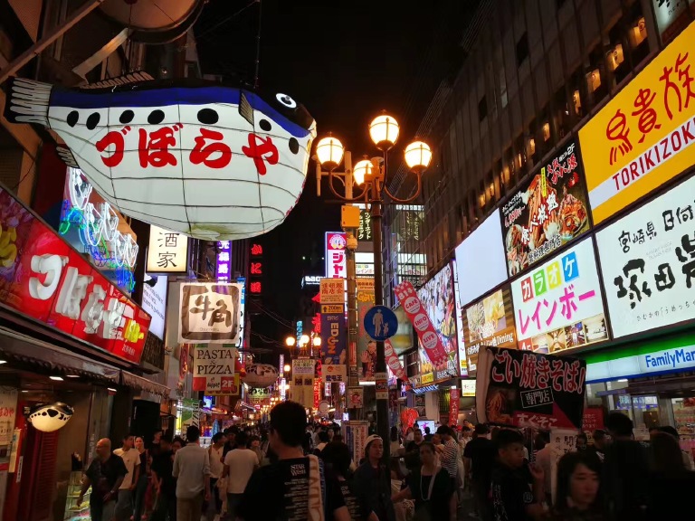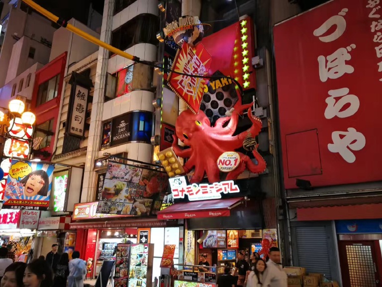 大阪心斋桥的道顿崛周边是日本殿堂级的美食街,道顿堀是一条位于日本大阪府大阪市的运河,在运河周边,满满的都是最具日本特色的美食,那里的美食更是多种多样,也更具代表性,最近的地铁站是难波站。在众多美食中,比较热门的店铺是道顿堀肉剧场、Cafe Gram、赤鬼、元祖串炸店,而很多中国游客会去的蟹道乐,我认为这是被国人吵出来的一个餐厅,里面是吃蟹的,味道一般。我比较喜欢吃赤鬼的章鱼烧和元祖串炸店里的鸡肉、虾,赤鬼的章鱼烧口味众多,我吃了2种,都很满足。