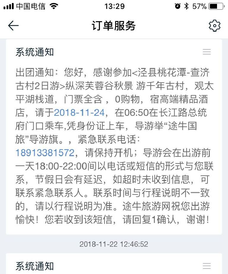 ⬇️完订单后你可以到订单服务中去查询,里面的系统通知会有详细说明的,并且在出游前一天晚上会以短信和电话通知你的。