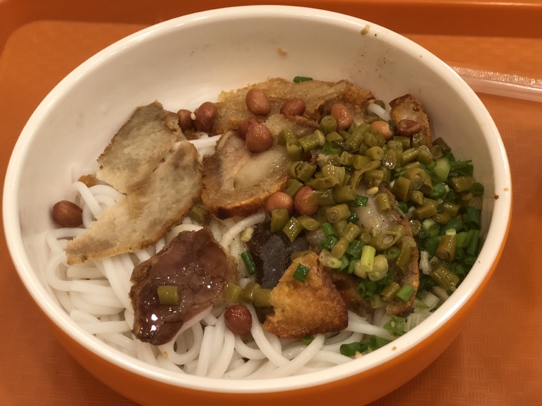 崇善米粉是桂林一家很有名气的米粉连锁店,在桂林有好几家,我去的这家位于中心广场附近,午餐时间,除了游客前来,更多的是当地的居民,还有很多学生也会来这家吃米粉。他们家除了米粉还有很多盖浇饭,我们点的是招牌牛腩米粉和卤菜米粉套餐,套餐内配有蔬菜、水果、饮料,内容还挺丰富的。米粉的味道比较中规中矩,卤菜第一次吃,口感还不错的,特别是脆脆的那部分,吃米粉的时候可以吃汤粉和干粉,要吃汤粉的话,在取餐处旁边就可以自己加汤,还能加一些小的配料,这家店的人均20元左右,作为连锁知名餐厅,性价比还可以,店内还有出售包装类的米粉,买带你回去送给亲戚朋友也不错。