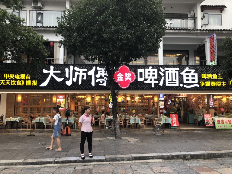 大师傅金奖啤酒鱼是桂林阳朔县数一数二的名店,在阳朔有好几家,其中有一家就位于阳朔西街的入口,店面挺大的,位置也很显眼,阳朔的餐饮店给我的印象非常好,就餐环境很干净,服务很热情,菜品的味道也不错。晚餐时间,免费提供绿豆汤、白凉粉和西瓜。我们刚到阳朔乘坐出租车的时候,就听司机说阳朔大师傅的啤酒鱼最好吃,他们家有套餐的,其中啤酒鱼味道真的是名不虚传,挺美味的,量很很大,其他菜品中,我最喜欢的是艾叶粑粑,第一次吃蛮新奇的,饭后甜味,味道很不错。人均消费70元,性价比极高。