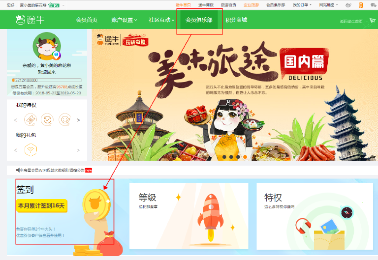 会玩签到的人都知道,只要在一个app的会员中心-我的里面就能找到签到字样。如果实在是不会用app,请登录途牛pc页面-会员俱乐部,点击签到就可以了。