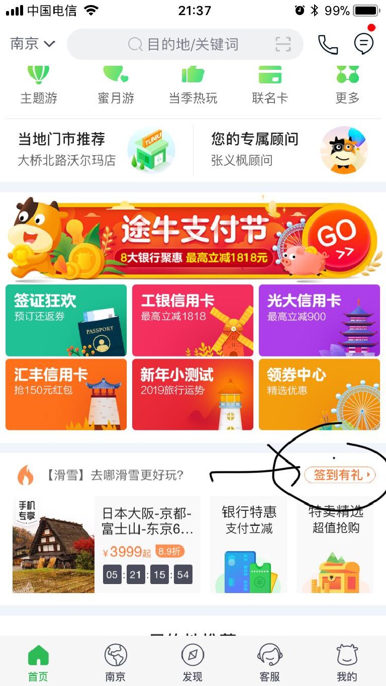 你是要在途牛平台签到的话,点击首页即可签到,如果是签证问题,可以联系客服。