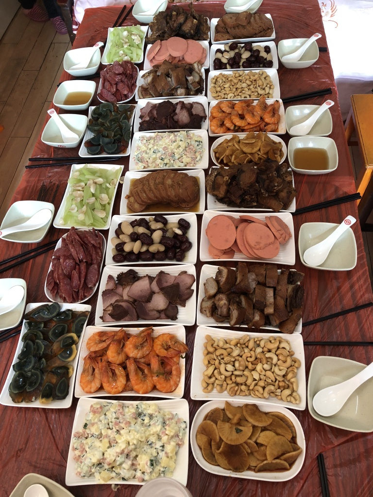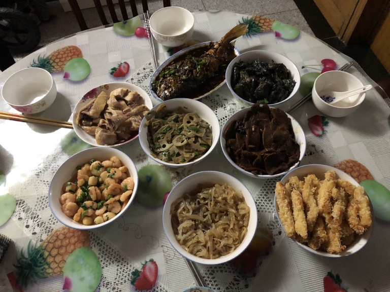妈妈年夜饭中许多菜都值得回味,现在老妈年岁己高,手脚己不灵活,记忆也不好,现在年夜饭都是我们儿女自己做了,每每吃年夜饭时姪女、外甥和我的孩子都会回忆外婆、奶奶的过去做的年夜饭,特别老妈做的捆腣每每回忆起来让大家垂涎欲滴。过去每年到春节前老妈不仅自己家做,左邻右舍也请她帮忙做,记得前二年老妈住院挂水,正好碰到原来的老邻居,虽然老妈己认不出来她了,但邻居却尾尾道来,夸老妈当年帮她做捆腣那麻利的过程,是啊,岁月匆匆,今非昔比,留给我们的是甜美而酸酸的回忆。去年春节我们尝试着做了一次,买了二个腣膀将里面骨头去掉洗净,然后将盐、八角、花椒在锅里干炒,散发出香味后取出,洒在捆腣中稍用力搓揉均匀,然后将事先准备好的纱布将其包裹起来,用麻线将其捆绑起来腌制几天后入味后,再起出晒一下后再将盐卤烧开后将捆腣再回一下卤后再次起出晒干及可,可是再也吃不出老妈做的那种嫩而香又有咬劲的滋味,所以今年也就不再去尝试。现在老妈也只能帮忙拈拈菜,年夜饭也只能成为回忆。