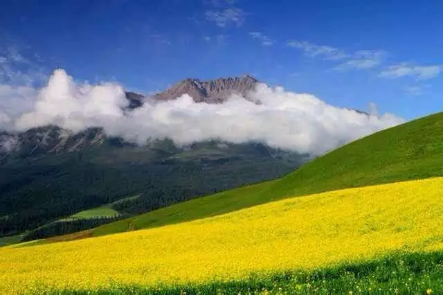 卓尔山位于祁连县10公里处,被称为天境祁连。夏季,卓尔山对面的牛心山山腰云雾缭绕,山顶终年积雪清晰可见,山下油菜花田和青稞田黄绿交错,远处丹霞地貌群山环绕,真正的天空之境,美景无限。如下图: