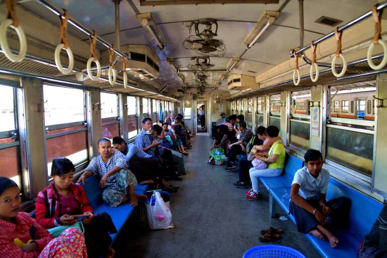 在缅甸仰光,有一条著名的环城火车,一圈38个车站,时间3个多小时。车票200甲,大约9角人民币。