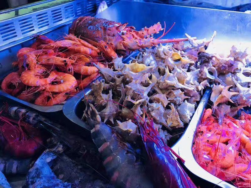 那天买的龙虾,快一米长了,有半个身子高,五六个人,一餐还吃不完。只好带回旅店,晚上接着吃,当夜宵了。因为新鲜,味道鲜美,很有弹性,回味无穷,至今依然怀念,深深怀恋着呢!