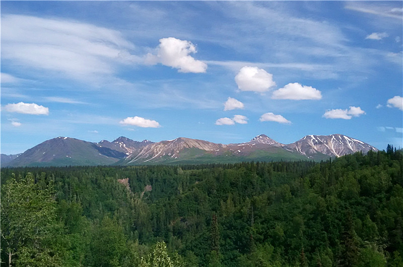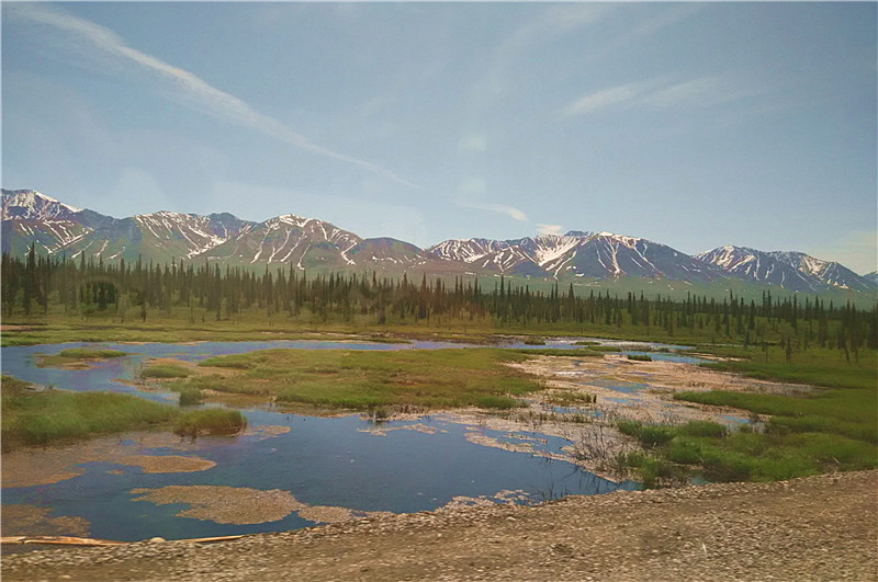 我们乘坐观光火车在迪纳里国家公园的雪山、原始森林、冰河、草甸中蜿蜒穿行……