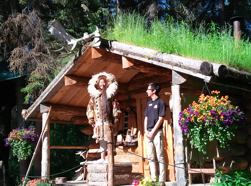 我们坐蒸汽船站沿切纳河游玩,切纳河水从北极雪山融化的雪水中得到补充,水量非常丰沛,是三文鱼(又称鲑鱼或大马哈鱼)的产卵地。岸边的爱斯基摩姑娘向我们展示制作三文鱼鱼干的过程,并邀请我们上岸参观他们的部落。