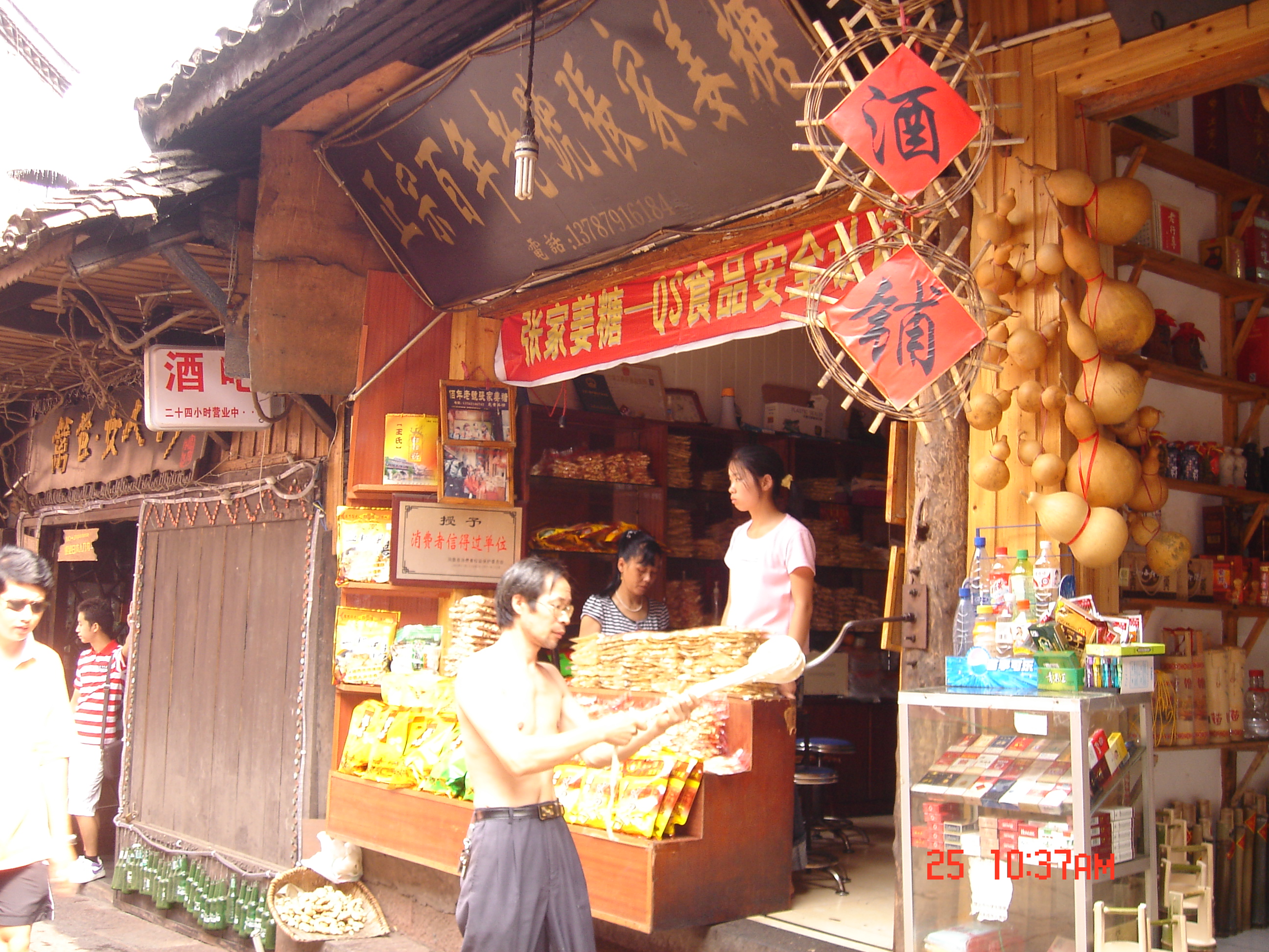 姜糖是凤凰的传统特产,为招徕顾客,街上经常可以看到现场拉制姜糖的场面,这位打赤膊的汉子极其夸张地将姜糖团挂到店门旁的铁钩上拉长、绕圈、再拉长,如此这般地反复拉扯,现场表演成分大过买卖,然后出售还带着温热的姜糖。