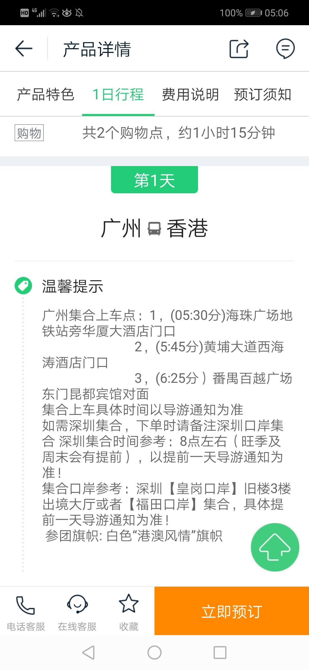 05:30:00 05:30海珠广场A1出口华厦大酒店门口 海珠广场华厦大酒店门口 05:45:00 05:45黄埔大道西广州海涛酒店门口 暨南大学南门 06:25:00 06:25番禺百越广场东一门集合 罗家牌坊附近 08:00:00 深圳皇岗口岸或福田口岸(导游通知为准) 具体集合时间以进港前一天领队短信为准!