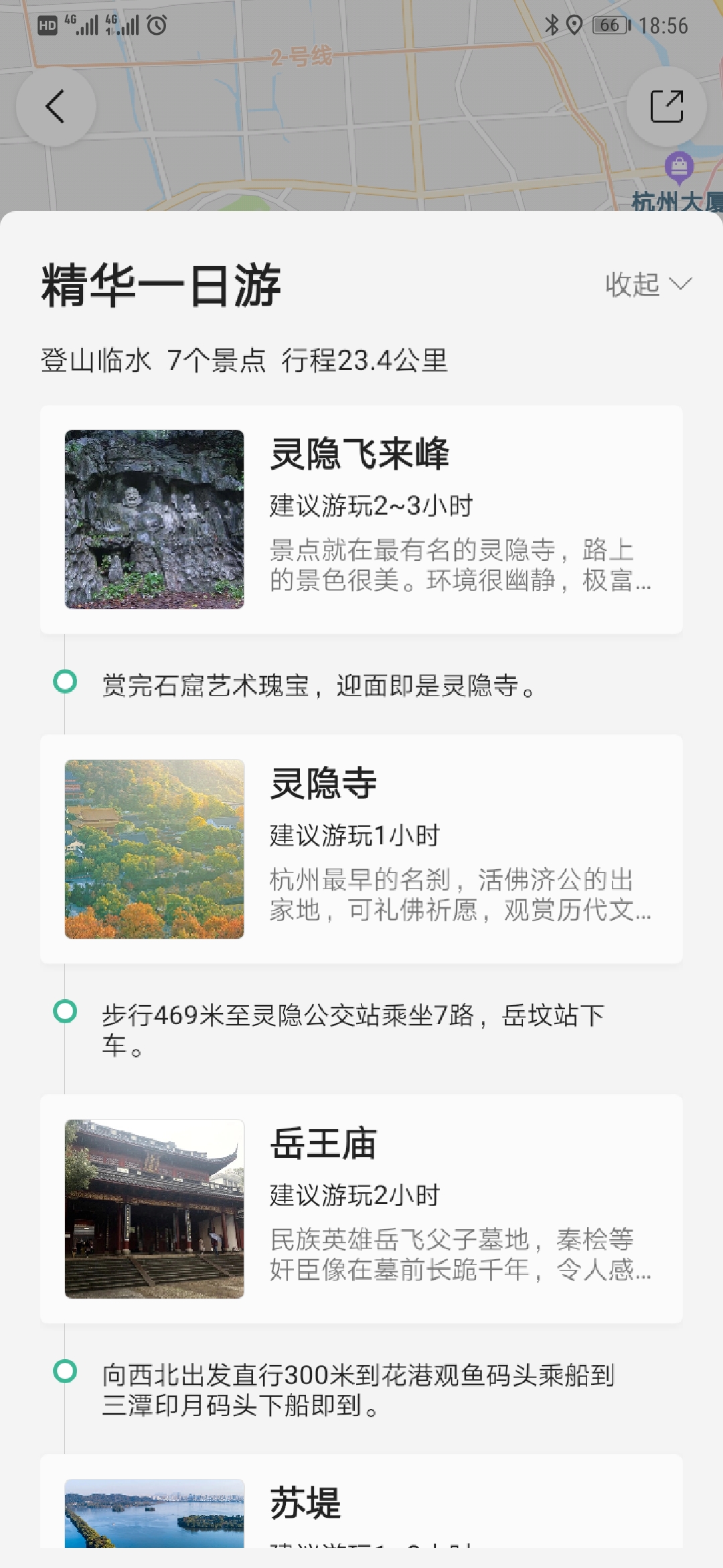 像一天的话可以选择“精华一日游路线”,西湖著名的几个景点都包含在内了,飞来峰、灵隐寺、岳王庙、苏堤、三潭印月、白堤、音乐喷泉,有山有水,先去飞来峰看看石窟,出来去对面灵隐寺,然后到西湖周边参观下岳王庙、坐船到湖里看看三潭印月这些,等到了晚上去看看喷泉和夜景,一共23.4公里的行程。
