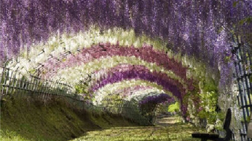 河内藤园于1977年4月开园,最引人关注的是面积达1000坪的大藤架,还有令人流连忘返的紫藤圆屋顶及紫藤隧道。樱花季节过后,随之到来的是紫藤花,其枝蔓如同葡萄藤。每年的4月下旬至5月中旬,各种紫藤花顺次绽放,将游客带进一个童话般极致浪漫的世界。