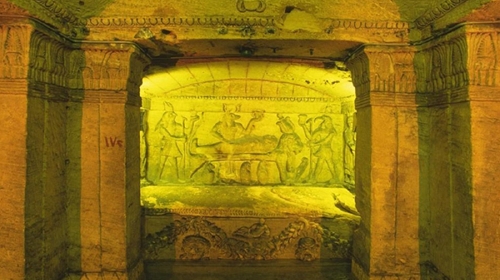 考姆舒卡法地下墓穴由于是墓室,所以这里不能拍照。顺着一口竖井往下走,螺旋式的楼梯越走越深,下到底部,感觉就像一个蚁穴,一间又一间的墓室,相互连通,墙壁都被掏成一个个格子间,每个格子可以放一具棺材。墓穴墙壁上随处可见的希腊罗马神话,细细看来就会体验到属于埃及的丧葬文化。