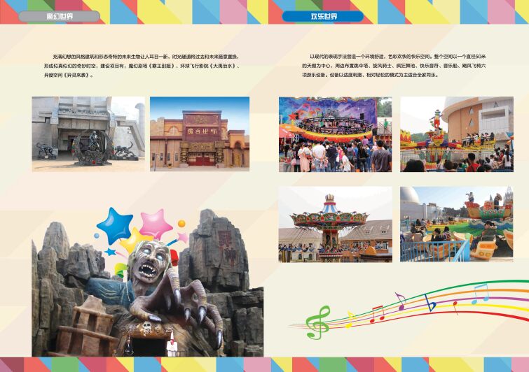 以现代的表现手法营造一个环境舒适,色彩欢快的游乐空间。整个空间以一个直径50米的天棚为中心,周边布置跳伞塔、旋风骑士、疯狂舞池、快乐音符、音乐船、飓风飞椅六项游乐设备。设备以适度刺激相对轻松的模式为主,适合全家同乐。