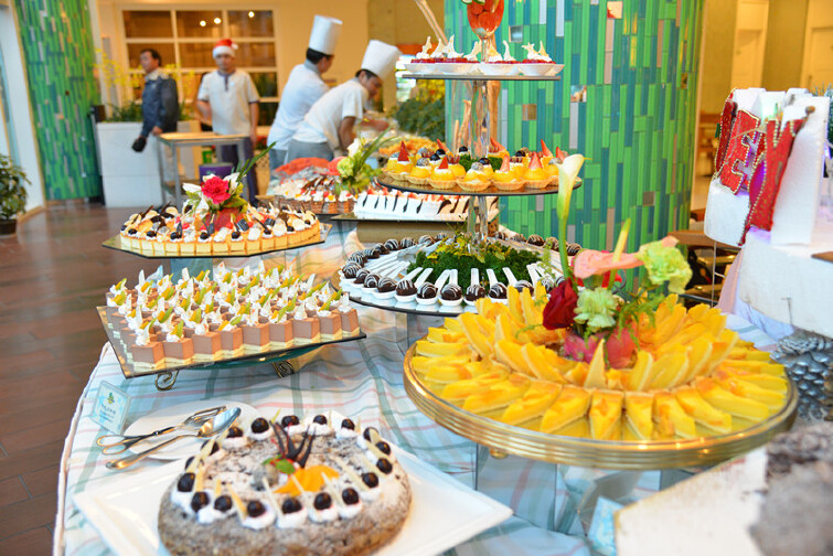 【DESSERT】(每天八款西式甜品更换)热带水果蛋糕、酒香巧克力蛋糕、意大利煮奶油 、马来椰冻 、金奖橙饼、瑞士卷、 时鲜水果盘、面包郎姆布丁(由于季节变换等因素,菜品以当天店内实际供应为准)