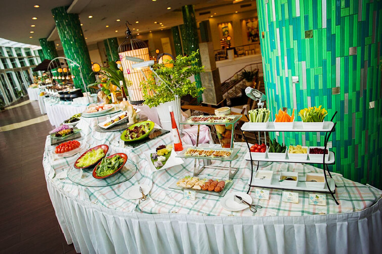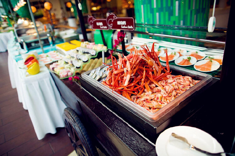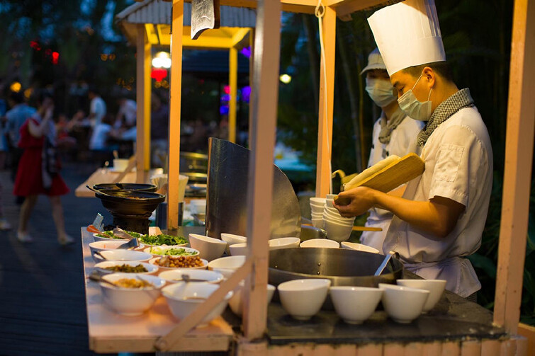 用餐环境自由自在,微风轻拂各类苍翠热带植物,热带花园以妖娆的身姿环抱探入开满清丽睡莲景观湖的用餐木平台,犹如身处爱丽丝仙境。可开怀畅享近200余种各类风味美食,从最新鲜的渔捕海鲜、各类高品质烧烤扒肉,到琳琅满目的东南亚美食、精致甜点、新鲜热带水果,还有鲜啤随你畅饮。