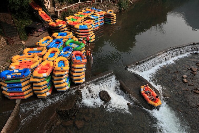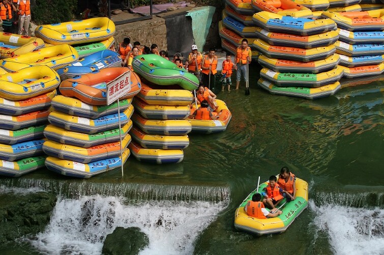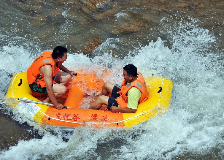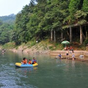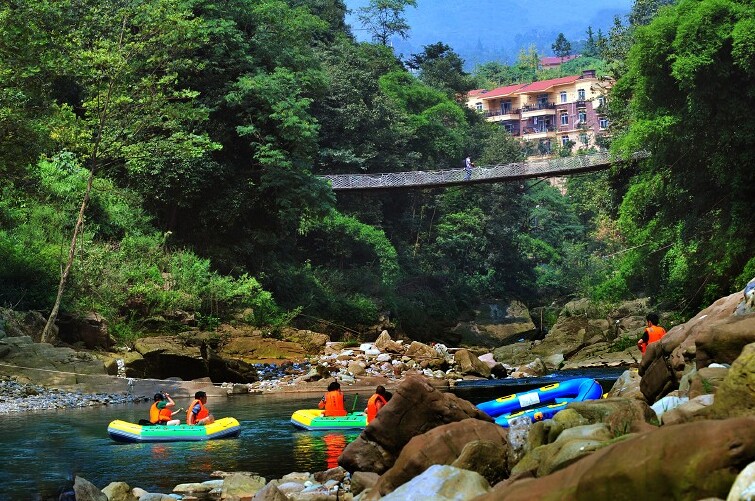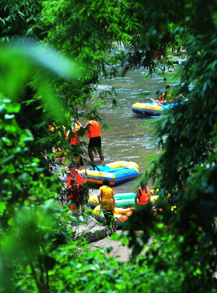 自助性皮筏漂流是旅游业的新兴产品,是集运动、娱乐、休闲、刺激性为一体的健身项目。如乘皮筏在清澈见底的碧波顺流而下,时而穿行于落差大、急弯多的险滩中,颇有回肠九转、有惊无险之感。时而荡舟汇水成潭、碧绿如镜的深潭中,悠闲自在,情趣妙趣犹然而生。沿岸群峰叠起,翠竹成林、蓝天白云、青山绿水美景自然天成,春可观桃花开满峡谷,红白镶嵌其间,美不胜收,秋可赏红叶,山间红遍层林尽染,壮观无限。在峡谷山水漂流,不但陶冶情性,也可以尽享大自然的乐趣。