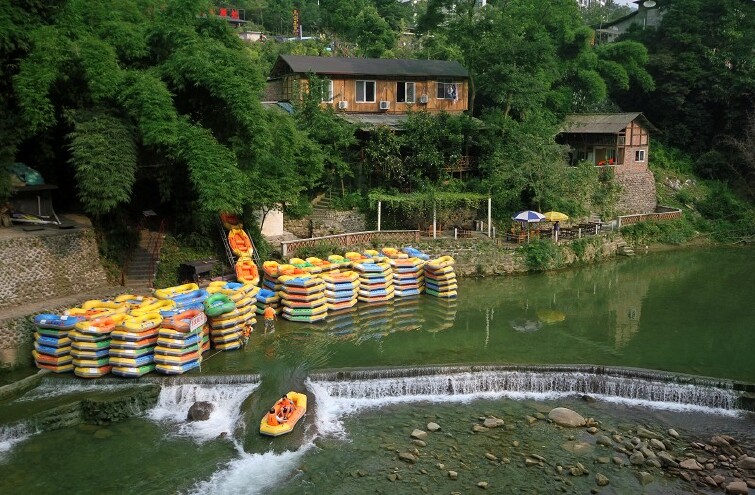 地图 青城水立方自然环境优越,气候凉爽宜人,常年平均气温较成都市区低2~5°,植被茂密,原始生态保护完整,空气中负离子含量丰富,有“天然氧吧”的美称。漂流位于都江堰市大观镇滨江村,漂流码头位于街子古镇去往青城后山路旁,味江之畔,从街子古镇到漂流仅10余分钟,离成都市区60余公里。漂流河段贯穿滨江村,全程约6公里,漂流时间约100分钟