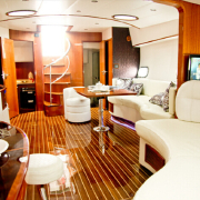 无需忍受公共游船的吵杂,乘坐来自意大利第勒尼安海的情人,具有欧陆风情的Gianetti 48私家豪华游艇,尽享无与伦比的舒适性与私密性。艇上设施一应俱全,全柚木后甲板,宽敞的沙龙区域配备真皮L型沙发,下舱按国内用户习惯被深度定制成完整的会客空间,沙发床,高保真音响,卡拉OK娱乐系统,厨房,卫生间一应俱全,为客户带来无与伦比的舒适享受。