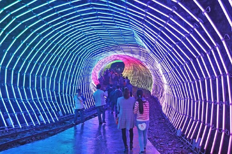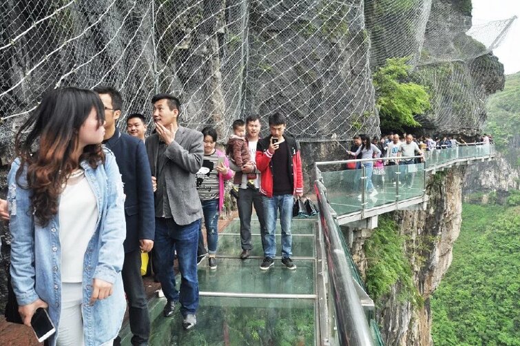 玻璃栈道属于万山国家矿山公园悬崖栈道主体的一部分,是公园提级改造后的全新旅游亮点。玻璃栈道立于悬崖峭壁之上,依山势而造,距离谷底100余米。走在玻璃栈道上,脚下就是“毫无遮挡”的峡谷,悬崖绿地顿时被“踩在脚下”,不管是前后左右还是上下观景,都没有任何视线阻碍,仿佛“悬浮”一般。