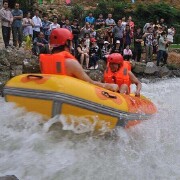 漂流会途径13个急险滩。其中刺激人心的莫过于虎落龙潭。该景点在龙潭,龙潭由上游水力长期冲刷,水深,清澈。漂流在冲刺到此后宛如老虎直扑潭水。激起阵阵浪花。很是刺激。