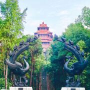 地图楚天台位于武汉市东湖磨山景区内,是磨山的标志性建筑,可与江南三大名楼媲美。楚天台屹立在磨山第二主峰上,依山傍水,高台矗立,大气磅礴。楚天台仿古章华台形制而建,高35.26米,楼顶放置着一个高1.2米的铜凤,正面墙上镶有用600多块天然大理石拼成“楚天仙境丹凤朝阳”图案,为楚天一绝。
