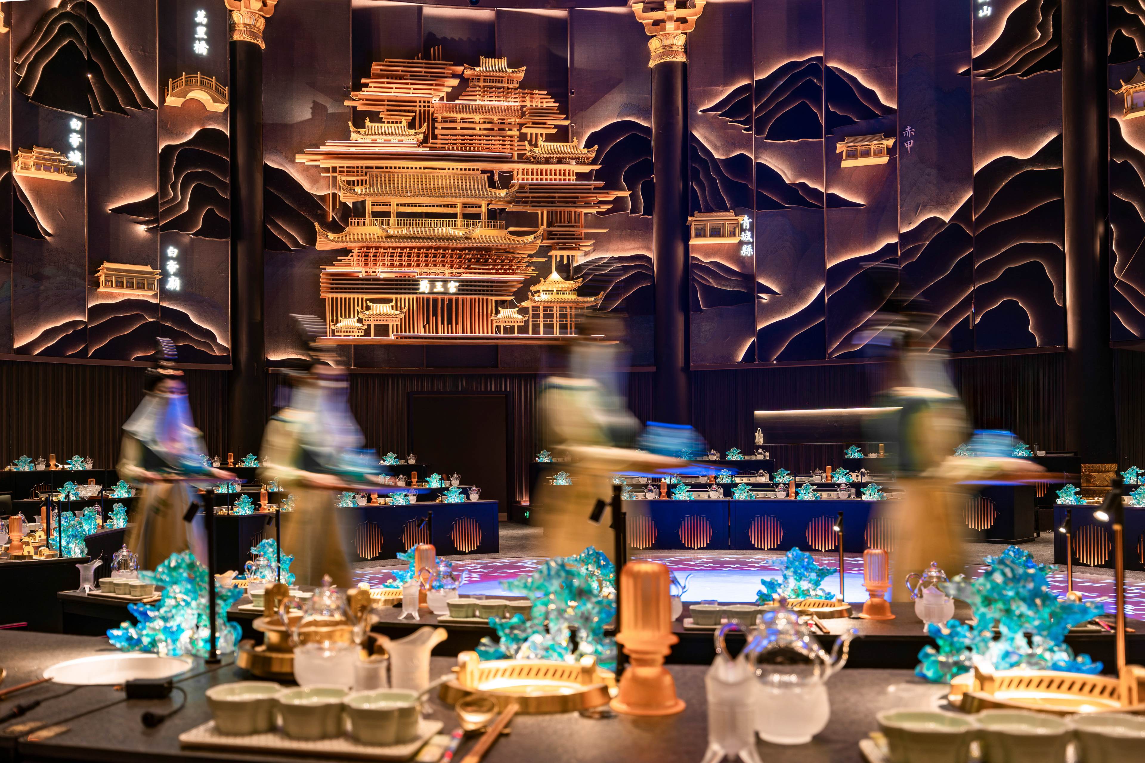 红鼎艳的空间设计是品牌叙事的恢弘基石。独创的青绿鼎沸空间体系,承《蜀川胜概图》的山水意境,融明代蜀王宫建筑规制,在现代摩天楼宇间重构“殿前鼎鸣,阶下霓裳”的盛世宴景。