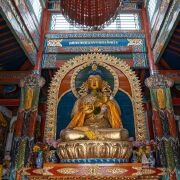 穿过三世佛殿后来到中间的院子,对面的建筑上清晰大字写有“呼市召庙文化展”。在召庙文化展建筑内部,左侧的墙上挂有历史上的宗喀巴等人像,右侧列有我国现存金刚座舍利宝塔召庙图,体现了呼和浩特召庙文化的渊源流长。