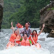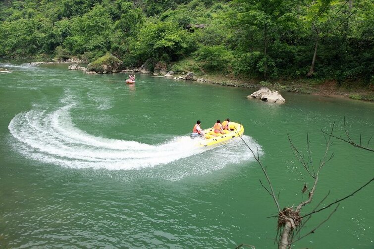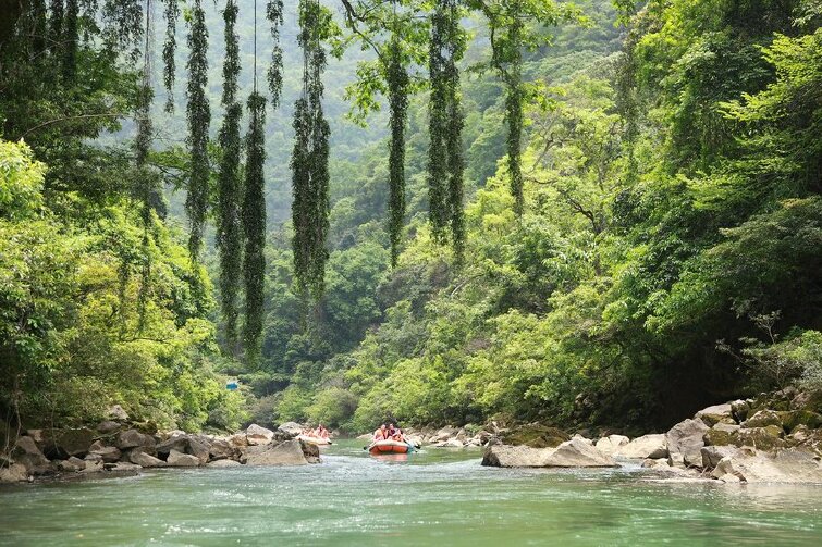 从磨里村开始漂流,顺水而下,两岸的峡谷风光尽收眼底,山上古树木种类繁多,郁郁葱葱,翠竹片片,随风摇弋,名贵药材随处可见。成群结队的猴子在原始丛林中嬉戏,为整个漂流增添了不少情趣。