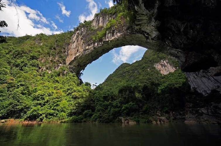 布柳河上还有一座由三座大山塌陷形成的天然石拱桥,坐落于漂流河段下游。石桥天成,鬼斧神工,桥拱对称,拱底平滑,当地人称为"仙人桥"。仙人桥拱孔跨度177.14米,桥宽19.3米,桥身长280米,桥身厚78米,总桥高165米,拱高87米,象一条巨龙横跨在河的两岸,绝景天成,气势雄伟,是罕见的天然石拱桥。被专家称为世界上最大、最美的水上天生桥,具有极高的观赏价值。