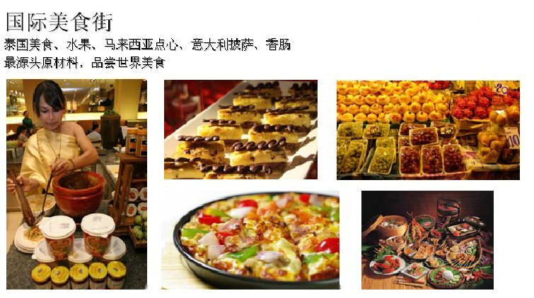 国际美食街,泰国美食、水果、马来西亚点心、意大利披萨、香肠。最源头原材料,品尝世界美食