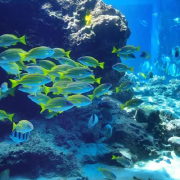 海底世界景区分为海底世界主馆和海豚表演馆两处。海洋世界主馆内,分为小池区、企鹅馆、海豹馆、触摸池、海龟池、海底隧道、表演休息、科普教室以及海洋精品店、观海餐厅等基础展馆。在馆内可以看到企鹅、海豹等海洋动物,可以体验用手触摸小鱼小贝的感觉,还可以在海底隧道观光,在沿海餐厅用餐,适合带小朋友前来娱乐游玩。在馆内还可以观看海豹表演、美人鱼剧目表演。海豚表演馆是一处剧场,主要是以海豚为主的动物表演,也是馆内较为精彩的表演。