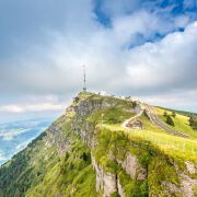 早在19世纪维克多·雨果等文化名人就到访过这里,1864年英国维多利亚女王也曾亲临此地。游客可以选择搭乘登山铁道列车或缆车登山。从菲茨瑙出发,有建于1871年的欧洲第一条齿轨登山铁道,从Goldau出发也有齿轨登山铁道,两条线路都可以登顶(RigiKulm)。若是从韦吉斯出发,则可以坐缆车线,从高空欣赏它的壮美风光,但只到山的中间站—卡尔特巴德半山小镇。它的山势较为舒缓,超过一百公里的步行道自上而下在山体的侧面延展开。这里的高山植被也多达上千种,甚至还有一条山花小径。还有一条约2小时可以走完的下山缓坡,景色宜人,也不需要特别强的体力。