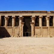 埃德夫神庙修建于公元前237年,历时200多年才竣工完成,主要供奉鹰头人身的天神荷鲁斯(Horus)。荷鲁斯是古埃及十分重要的神之一,通常被描述为戴着埃及皇冠的神鹰,古埃及的法老们都视自己为荷鲁斯的化身。埃德夫神庙并不很大,只有一座主要神殿,殿外有荷鲁斯的鹰头雕像。内部与其他神庙都类似,外间是一间巨柱大厅,内间为石室,里面有一条罕见的鳄鱼木乃伊。