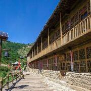 从崖底抬头仰望,极似空中楼阁。而这些山中人家大都建有小阁楼,站在阁楼上凭窗览遍万顷苍翠,依门望尽百里云海。村子背后是高耸入云的大山,前面是一条深沟,原本只能沿着陡峭的山路进村,近几年因旅游开发而修建了水泥路,汽车可以开到村下的停车场。