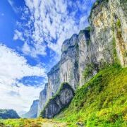 景区内有数量众多的溶洞,尤其是仙人府的薄层状灰岩类硅质岩,国内罕见;又有四层自生桥,造型奇特、得天独厚,景观尤其独特。湄水蜿蜒崇山峻岭之间,似玉带轻扬,清澈透明、静影沉壁,两岸高峰耸立、怪石嶙峋。较为壮观的一段,百丈高崖直插云霄如铜墙铁壁,气势夺人,夹江形成约10公里的峭壁画廊。