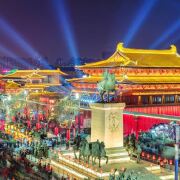 大唐不夜城以大雁塔为依托,北起玄奘广场、南至唐城墙遗址公园、东起慈恩东路、西至慈恩西路,贯穿玄奘广场、贞观文化广场、开元庆典广场三个主题广场,拥有六个仿唐街区和西安音乐厅、西安大剧院、曲江电影城、陕西艺术家展廊四大文化建筑。大唐不夜城晚上灯火璀璨,光影中的仿古建筑流光溢彩,气势恢宏,宛如大唐盛世再现。
