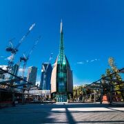 地图天鹅钟塔位于美丽的天鹅河畔,又叫珀斯钟塔,是珀斯的地标性建筑。这座带有玻璃尖顶的天鹅钟塔高82公尺,晚上塔身会变换不同的颜色,现已成为各地游客的理想旅游地。天鹅钟塔内存放着来自英国各地的18个大钟,组成一组,随着人员的击钟演奏而奏出不同的音乐,游客也可以亲身体验敲钟。这组钟也是当今世界上大的一组铜钟之一,也是英格兰以外的皇家钟楼。天鹅钟塔顶层还有26个小铜钟,游客可以投币并通过电子菜单选择想要听的曲目。天气好时,游客还可以上到天鹅钟塔六楼的户外平台上欣赏珀斯市区和天鹅河的美景。