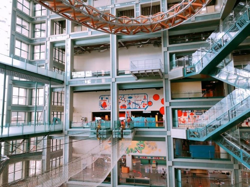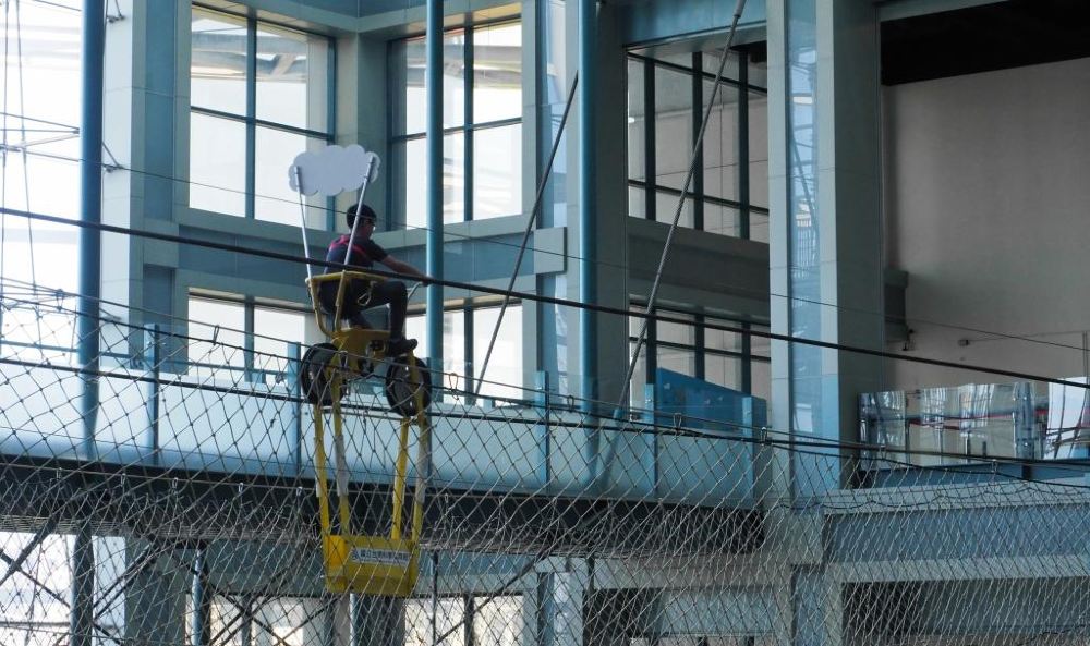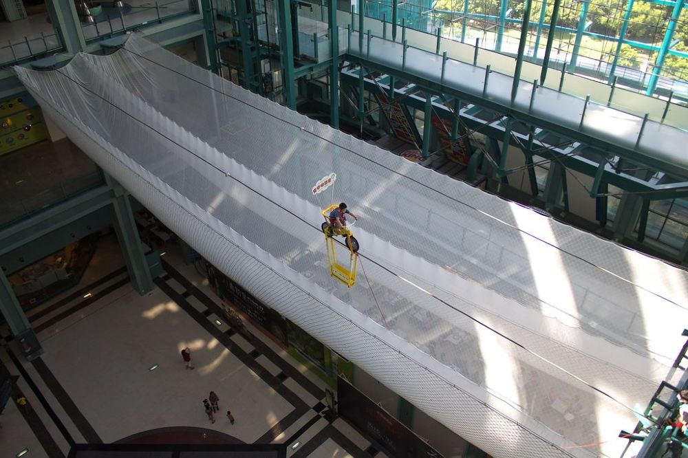 空中脚踏车应用原理,交互式空间脚踏车,架设于离地五楼高,展现平衡力原理,成人和孩子们借由骑乘脚踏车过程中,可亲自体验相对平衡和重力中心原理。