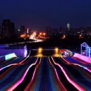 除了娱乐设施外,这里的夜景也是一大亮点。当黑夜渐近,绚烂的灯光将游乐场装扮的如梦似幻,彩虹般的灯带宛若璀璨星河,营造出浪漫酷炫的观赏体验,让人沉醉其中。