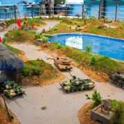 该园区以国防教育、军事科普、学习体验为主要内容,能够满足各年龄各群体的需求,是一个集综合性、科技性、互动性为一体的国防知识学习和军事体验场所。总占地约10358平方米,主要包括国防知识展、装备知识展、射击模拟训练、沙盘坦克对战等内容。其中,沙盘坦克对战系统,是一款全新独立研发、国内首创的装备对战平台,以数字模拟对抗技术为核心,通过操作者的操控,在搭建的大型沙盘环境下实现坦克对战的全新体验。射击模拟训练提供标准的室内射击训练和对抗射击体验,具备很高的安全性和专业性。搭建的大型航母编队作战场景,以海洋波浪场景台、大型作战体系装备模型、灯光效果渲染等方式,给人以视觉冲击感,同时让人们了解海军及装备知识,增强海洋国土意识和海洋国防观念。此外,还配套有军事主题的室内外活动场所,军事色彩浓厚的学习休闲区域,让人们在寓教于乐中接受国防教育的同时,还能够进行放松休闲。