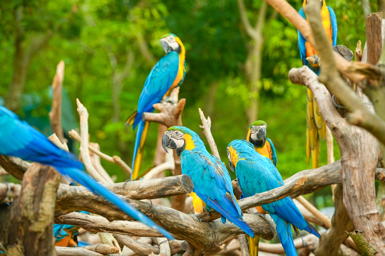 △鹦鹉迎宾,多种大型鹦鹉向你问好:蓝眼巴丹鹦鹉、折衷鹦鹉、金刚鹦鹉、葵花凤头鹦鹉!