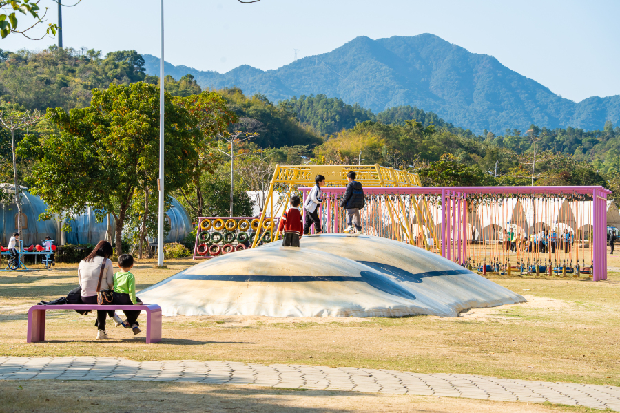 △无动力乐园:轮胎攀爬网、熊猫蹦蹦云、吊装桥、龙舟秋千、六人自行车,不充电也能快乐满分!