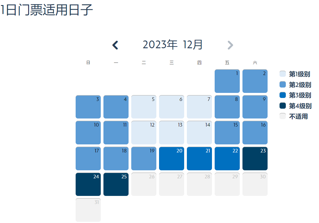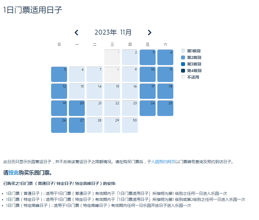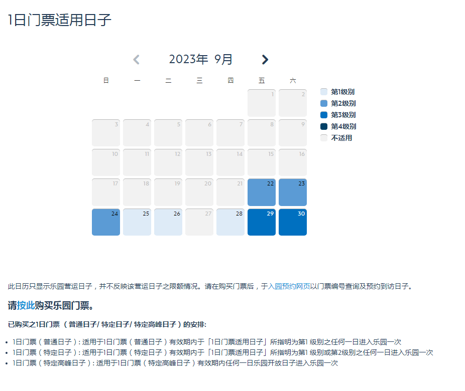 第1级别,第2级别,第3级别,第4级别查询详见https://www.hongkongdisneyland.com/zh-cn/new-day-calendar/;