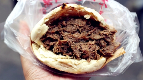 西安的肉夹馍和我们日常见过的肉夹馍可不一样。我们的认知中,肉夹馍里面有香菜、生菜、青椒什么的,西安的肉夹馍只有一种——肉!浓浓的肉汁裹着剁得细腻的肉馅一起被夹进刚出炉的面饼里,面饼也是烫烫的脆脆的,散发着焦香。一口咬下去,厚实多汁,香而不腻,而且一点也不塞牙,那是相当的开胃~不过请做好排队的心理准备【doge】。